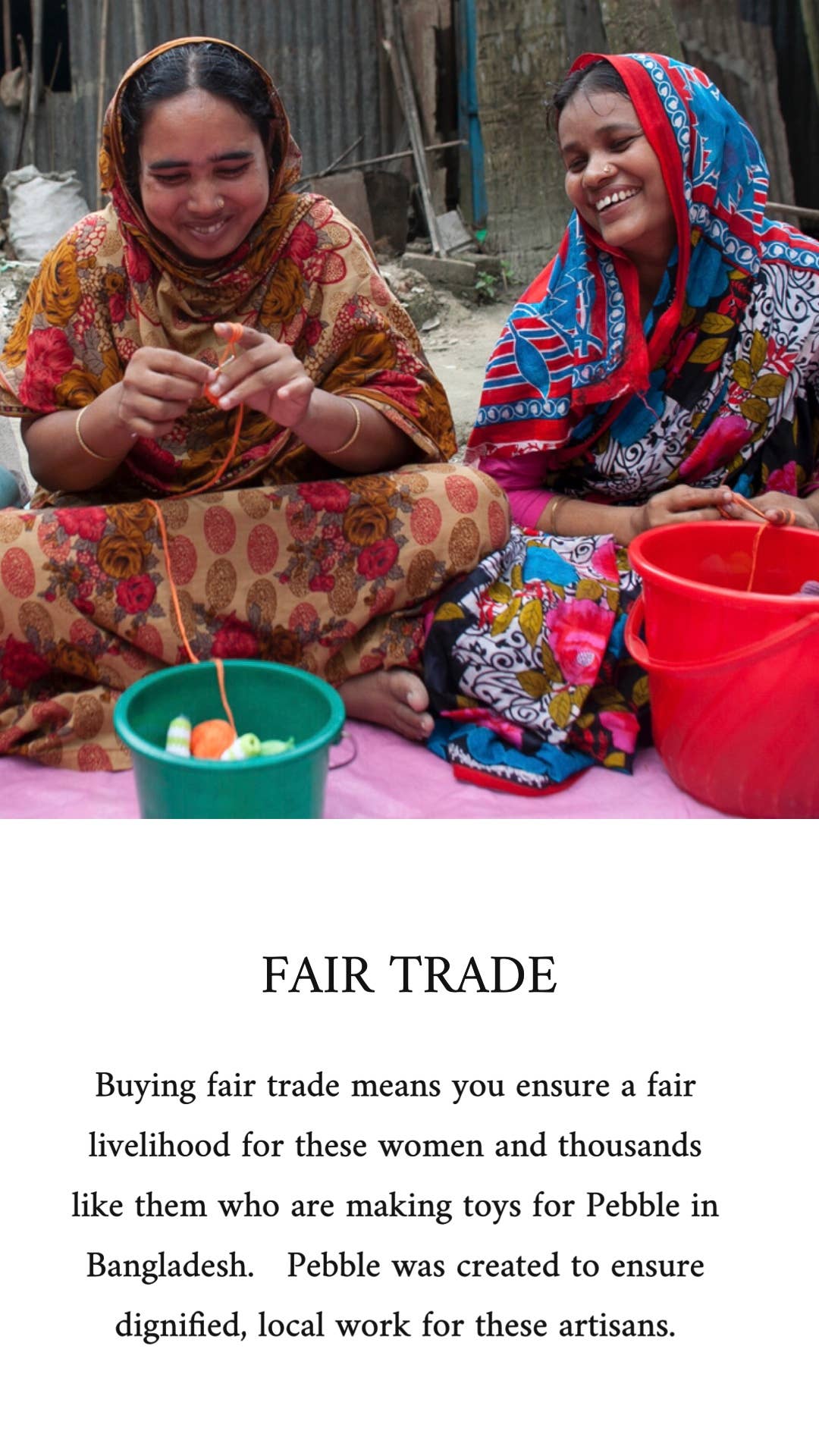 All Pebble products are made by HathayBunano. HathayBunano, meaning handmade or hand knitted in Bangla, is a non-profit fair trade organization in Bangladesh.