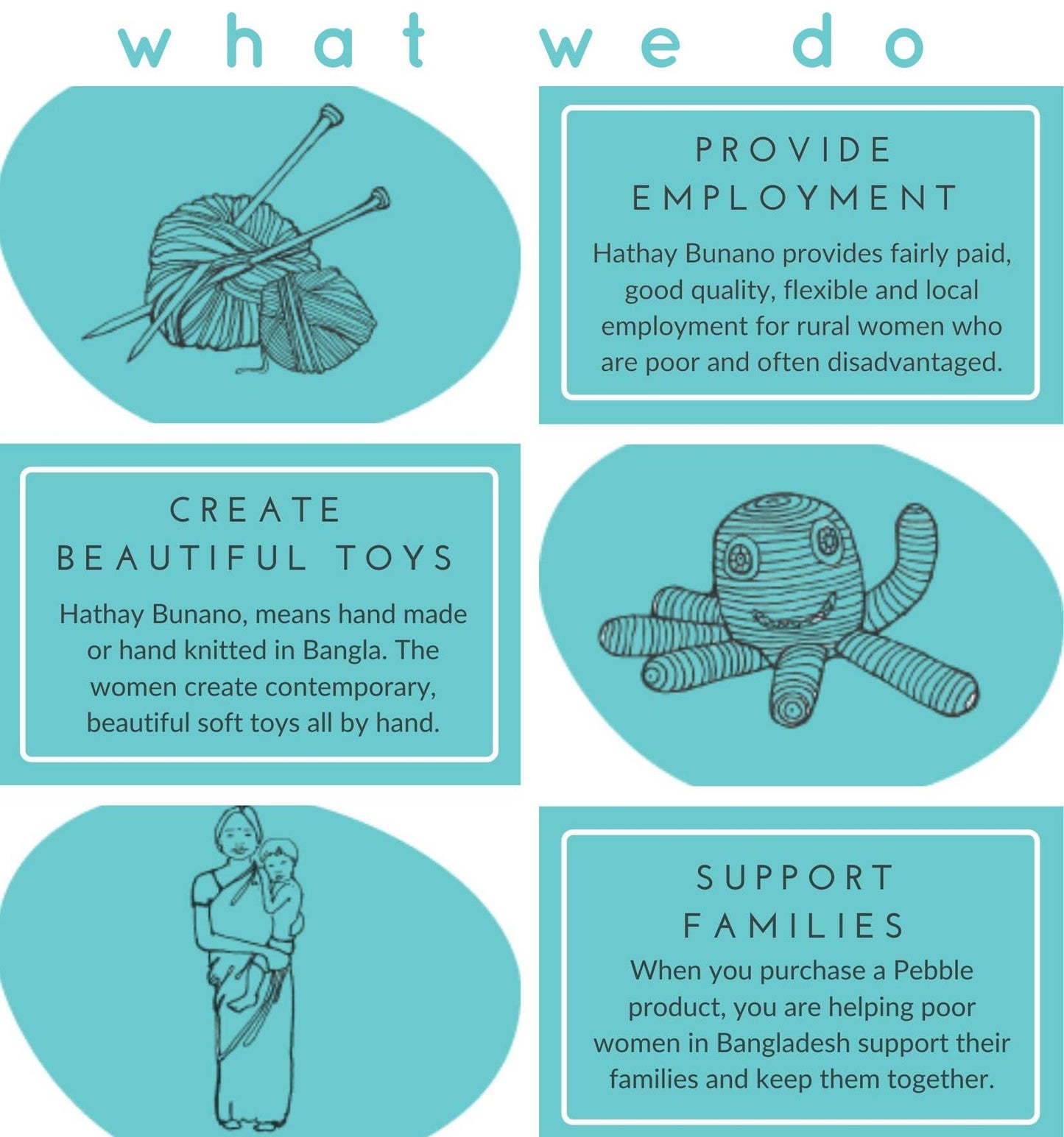 All Pebble products are made by HathayBunano. HathayBunano, meaning handmade or hand knitted in Bangla, is a non-profit fair trade organization in Bangladesh.